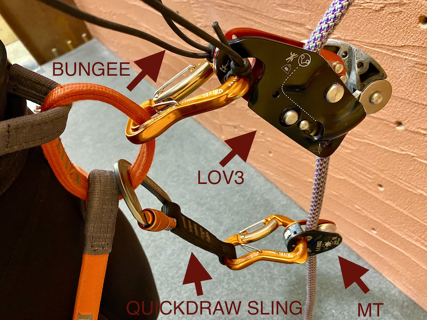 - Attach the free carabiner on the MT's quickdraw sling to your belay loop beneath the LOV3.