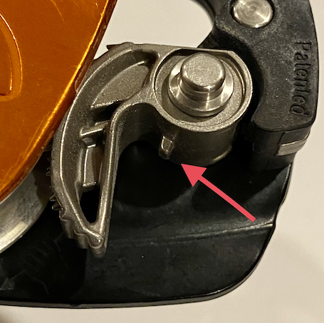 The MT has a small tab on the locking mechanism that can cause it to lock open while climbing (see below). This disengages progress capture mode and prevents the device from catching you if you fall and your primary device fails. Some people file this tab off to prevent this issue. If you choose not to do this, be sure to check the MT periodically while climbing to ensure that it is still in progress capture mode.