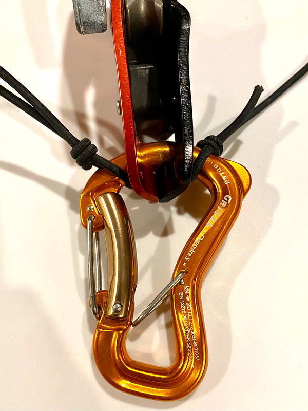 - Attach a small locking carabiner to each end of an 11cm quickdraw sling.